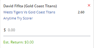 David Fifita Try - Stake 2.5 Units, Minimum Odds 2.2, Best Book - Lads/Neds