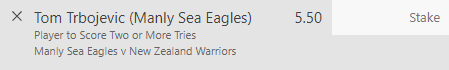 Tom Trbojevic 2+ Tries - Stake 1 Unit, Minimum Odds 4.8, Best Book - BET365