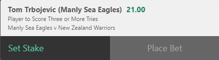 Tom Trbojevic 3+ Tries - Stake 0.5 Units, Minimum Odds 14, Best Book - BET365
