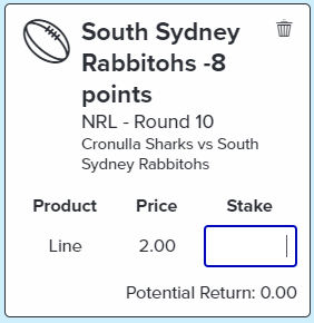 Rabbitohs -8, Stake 2.5 Units, Minimum Odds 1.9, Best Book - Topsport