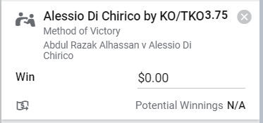 Alessio Di Chirico by KO/TKO - Stake 1.5 Units, Minimum Odds 3.0, Best Book - Sportsbet