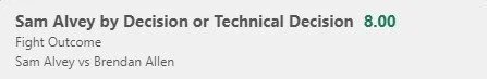 Sam Alvey to Win by Decision - Stake 0.5 Units, Minimum Odds 7.0, Best Book - BET365