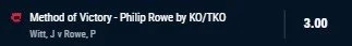 Phillip Rowe by KO/TKO - Stake 1.5 Units, Minimum Odds 2.6, Best Book - Pointsbet