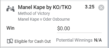 Manel Kape by KO/TKO - Stake 1.5 Units, Minimum Odds 2.9 - Best Book - Sportsbet