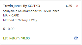 Trevin Jones by KO/TKO - Stake 2 Units, Minimum Odds 3.2, Best Book - Lads/Neds